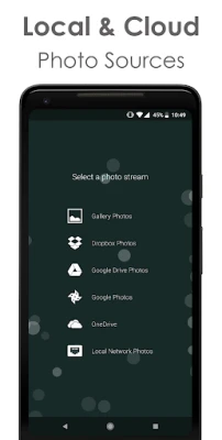 You can stream your photos seamlessly from local photo gallery and cloud services such as Google Photos, Dropbox, Google drive, Microsoft OneDrive, local network (Samba/SMB) and more to come!