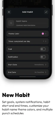 Customize habit names, descriptions, personalized icons, system notification settings, and set the frequency of completion for each habit.