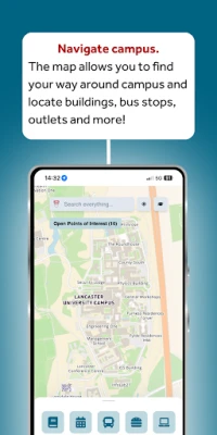 Maps - easily navigate campus! Locate buildings, rooms, bus stops and bus arrival times, outlet opening times and locations, upcoming events and their venues, and even available PCs across campus.