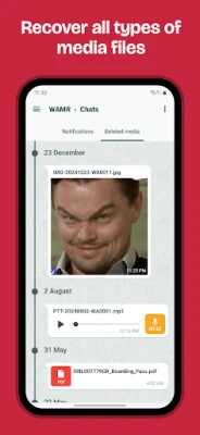 WAMR helps you recover deleted text messages and media attachments (photos, videos, voice notes, audio, GIFs, and stickers) from your chat apps. Stop wondering what was said and regain control of your conversations!